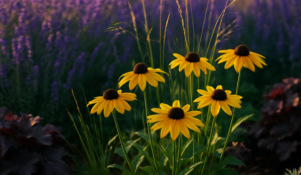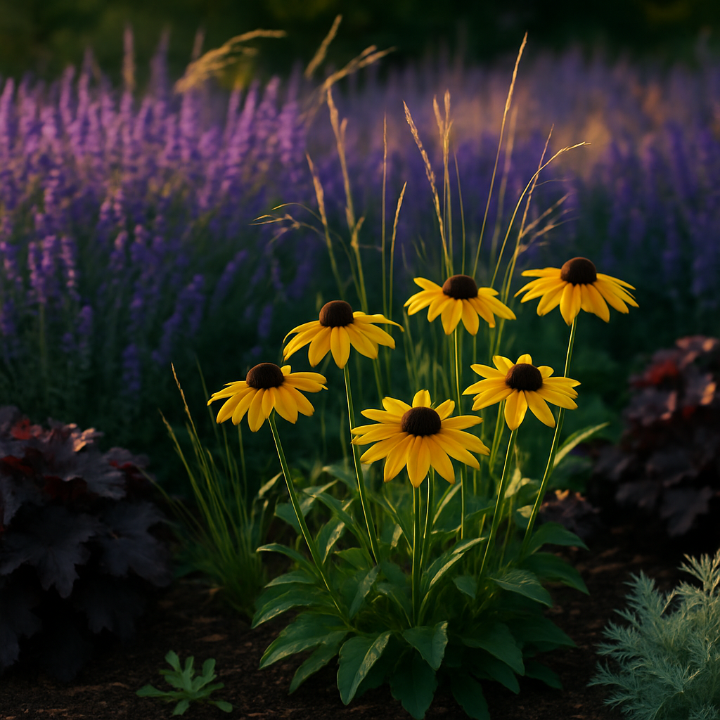 Eine gelungene Kombination verbindet unterschiedliche Texturen und Höhen: z. B. Lavendel (blau) als ruhiger Hintergrund, davor Rudbeckia (gelb) als leuchtender Akzent und feine Gräser wie Stipa für Bewegung. Achte auf ähnliche Standortansprüche (Sonne, Boden) und wiederhole Farben rhythmisch über den Garten verteilt. So entsteht Harmonie, ohne dass alles einheitlich wirkt.