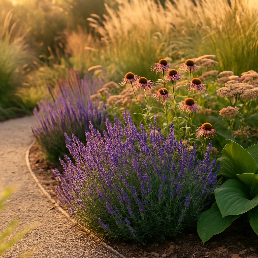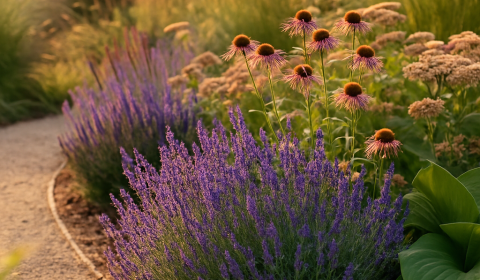 Lavendel, Sonnenhut (Echinacea) und Phlox bringen jetzt Fülle. Entferne verblühte Blütenstände gezielt, um die Blüte zu verlängern.