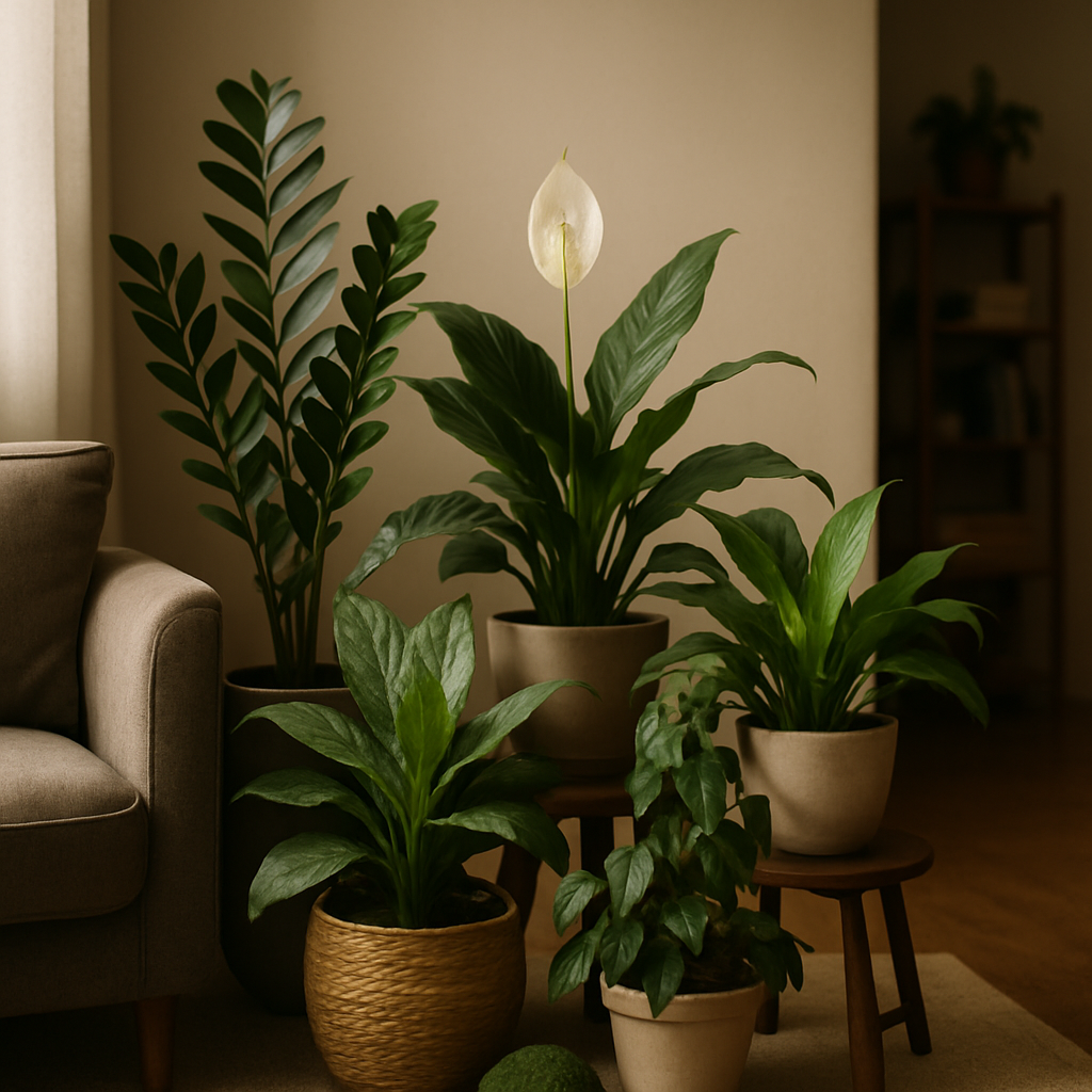 Für wirklich sehr dunkle Räume sind robuste Dauerbrenner ideal: Zamioculcas (Glücksfeder), Sansevieria (Bogenhanf), Aspidistra (Schusterpalme) und manche Efeu- und Philodendron-Sorten kommen mit extrem wenig Licht zurecht. Auch Epipremnum (Pothos) funktioniert oft. Bedenke: Absolute Dunkelheit klappt kaum — wenn möglich ergänze ein kleines LED-Licht für wenige Stunden täglich.